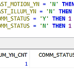 [각각의 칼럼 개수 세기] -> 각 칼럼의 개수를 카운트 하면서 별칭도 줄 수 있는 형태를 원함 -> select랑 union덕지덕지 하면 버퍼속도 낭비 심해짐 해서 이렇게 짜는것이 제일 깔끔함 SELECT COUNT( CASE WHEN LAST_MOTION_YN = 'N' THEN 1 END) LAST_MOTION_YN_CNT , COUNT( CASE WHEN LAST_ILLUM_YN = 'N' THEN 1 END) LAST_ILLUM_YN_CNT , COUNT( CASE WHEN COMM_STATUS = 'Y' THEN 1 END) COMM_STATUS_CNT_Y , COUNT( CASE WHEN COMM_STATUS = 'N' THEN 1 END) COMM_STATUS_CNT_NFROM ELDERL..